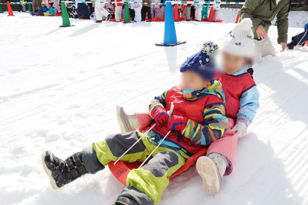 山道をどんどん進むと、少しずつ雪が積もっているところも・・・スノーパークに着くと、真っ白な雪景色に、子どもたちも大興奮😆