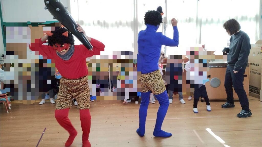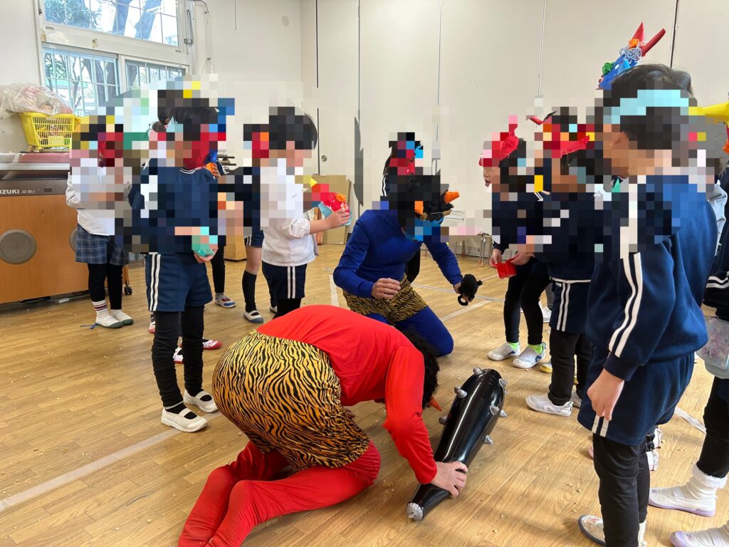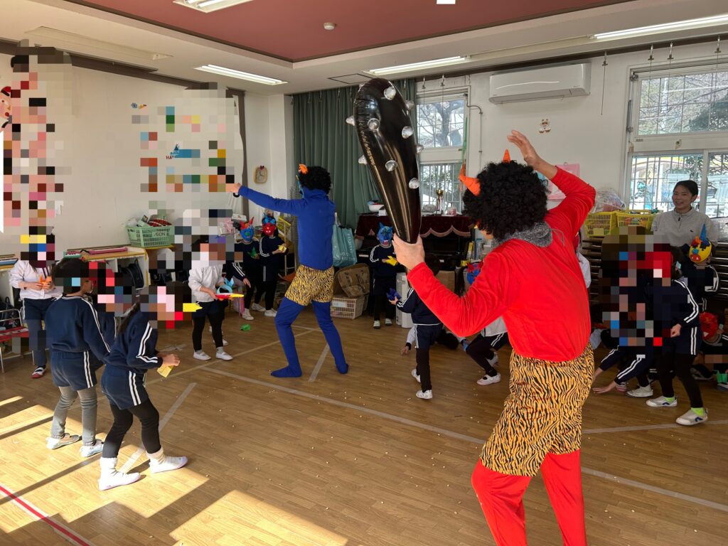 最後は、鬼さんも「ごめんなさ~い」と・・・みんなで協力して、鬼を退治することができました✌