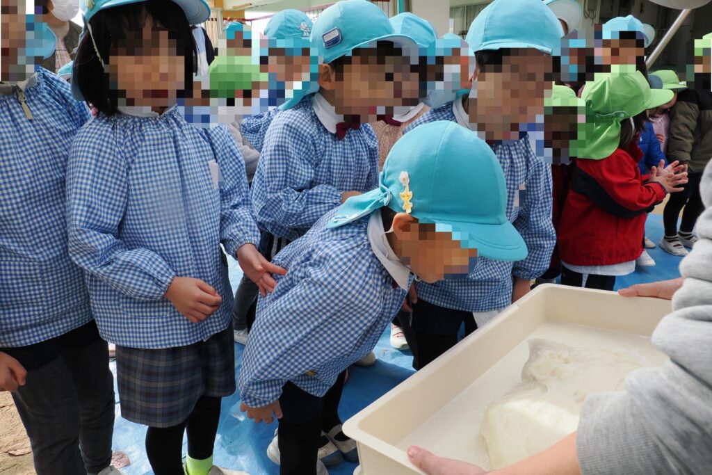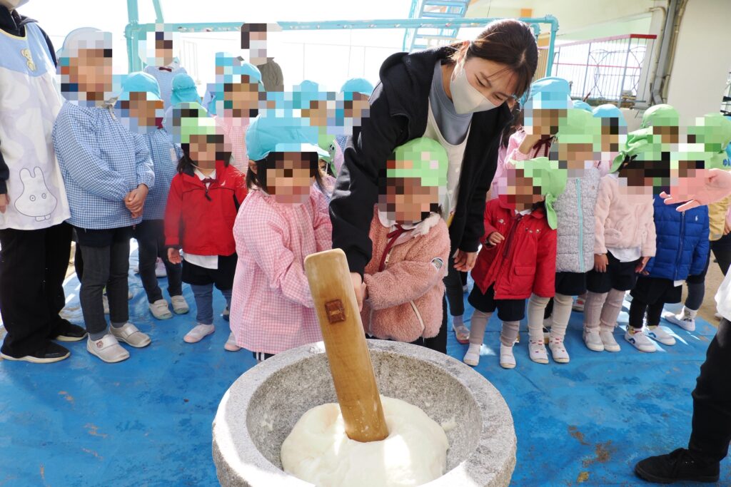 おもちつきは2人1組のペア―になって、おもちを目掛けて「よいしょ~!よいしょ~!」と力いっぱいつきました。だんだんと柔らかくなるおもちに「わぁ~おいしそ!😆」「すご~い!!のびてる😮」と嬉しそうでした。