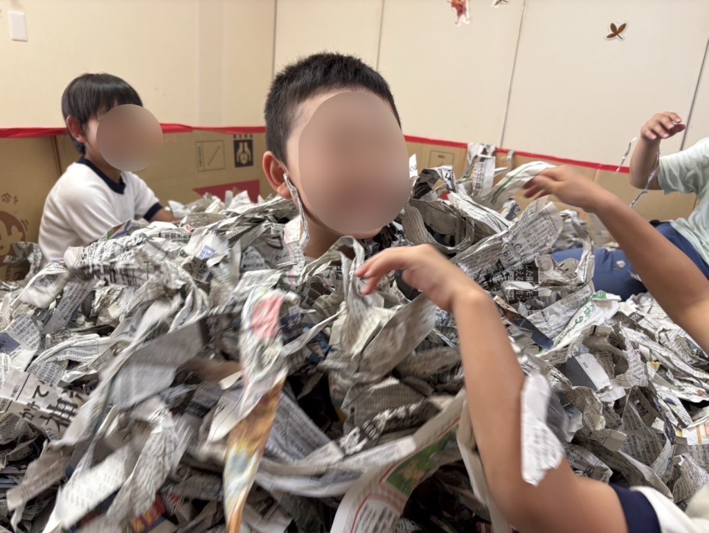 新聞紙プールでは、新聞紙を投げたり、新聞紙の中を泳いでみたり、楽しかったね♡
